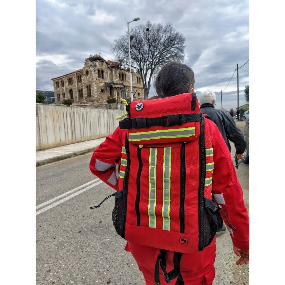 First response backpack specially designed for field hospitals. It also includes a detachable compartment that can be used as a waist bag for triage and personal belongings.